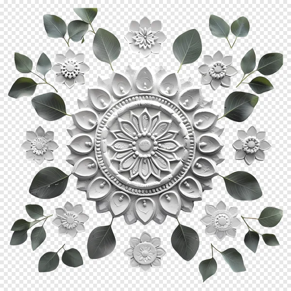 Enhance your design projects with this stunning free PNG image, featuring an elegant white floral medallion and delicate botanical leaves arranged against a striking black background. The intricately carved, plaster-like central rosette is surrounded by smaller floral accents and realistic green foliage, offering a sophisticated and timeless aesthetic. Perfect for digital art, scrapbooking, invitations, website graphics, or printable designs. Download this high-quality, ornamental graphic for free to add a touch of classic beauty and versatile elegance to your creations. Ideal for both vintage and modern botanical themes.