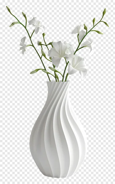 Download this beautiful PNG featuring elegant white flowers and delicate buds arranged in a sleek, modern sculptural vase. The striking twisted design of the vase, combined with the pristine white blooms and vibrant green stems, creates a sophisticated, minimalist aesthetic against a pure black background. Perfect for adding a touch of serene beauty to your designs, presentations, or digital projects. This high-quality transparent PNG is available for free download, offering versatility for various creative uses. Enhance your graphic design, website, or social media content with this clean and contemporary floral image. Get your free transparent flower vase PNG now!