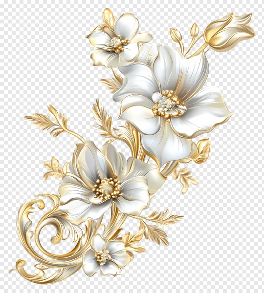 Download this stunning free PNG of an elegant white and gold ornate floral arrangement. Featuring beautiful white blossoms with golden accents, intricate gold leaves, and decorative scrollwork, all on a transparent background. This high-quality, lavish flower cluster is perfect for adding a touch of luxury to wedding invitations, greeting cards, digital art projects, scrapbooking, or any creative graphic design. Enhance your designs with this free, opulent floral element!