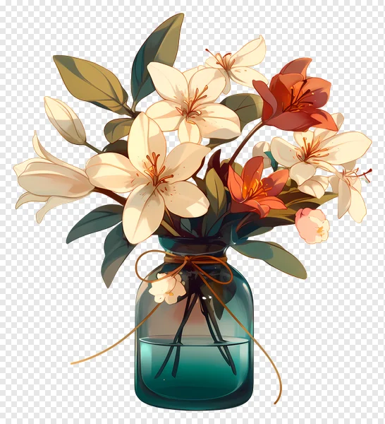 Download this exquisite transparent PNG of an elegant lily bouquet, perfect for all your creative projects! Featuring vibrant white and striking reddish-orange lilies nestled in a stylish teal glass vase, adorned with a delicate brown bow. The high-quality illustration style with its clean lines and rich colors makes it ideal for digital art, website graphics, invitations, scrapbooking, or presentations. With its transparent background, seamlessly integrate this beautiful floral artwork into any design. Enhance your projects with a touch of sophistication and natural beauty. Get your free download today!