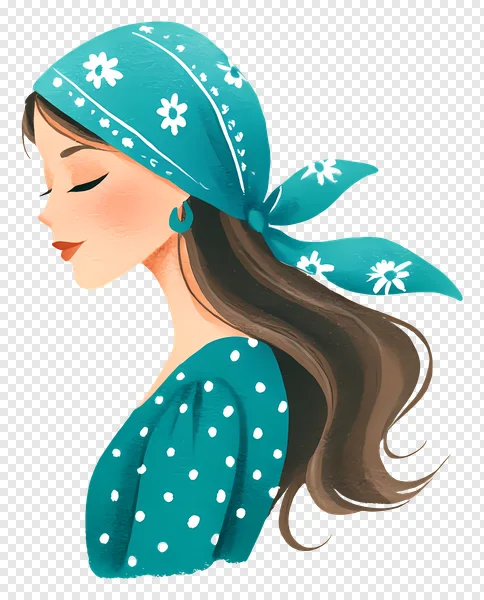 Discover this exquisite free PNG image featuring an elegant woman in profile, adorned with a vibrant turquoise headscarf with delicate white flowers and a charming teal polka dot dress. Her serene expression, delicate features, and flowing brown hair make this digital art illustration perfect for a wide range of creative projects. Ideal for graphic design, social media posts, web design, or personal crafting. Download this high-quality, transparent background image now to add a touch of stylish femininity and vintage charm to your designs!