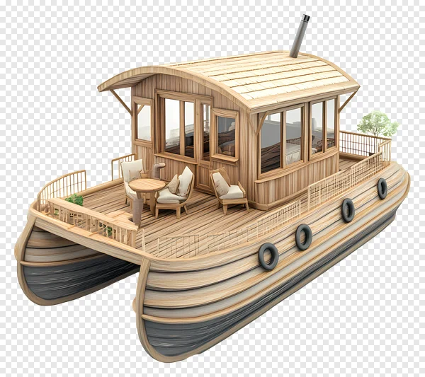 Discover our stunning free PNG of a luxurious wooden houseboat catamaran, meticulously rendered and isolated on a transparent background. This unique floating home design features a beautiful rustic wood finish, a cozy outdoor deck with stylish furniture, and large windows offering panoramic views. Perfect for architects, interior designers, travel bloggers, or anyone creating projects related to tranquil water living, vacation rentals, or sustainable architecture. Download this high-quality, transparent image for free and elevate your designs, presentations, or website content. Ideal for illustrating dream homes, eco-tourism concepts, or unique waterfront properties with ease.