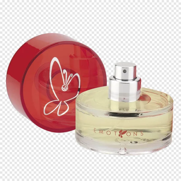 Elevate your designs with this exquisite free PNG image featuring an 'Emotions' perfume bottle. This high-quality, transparent background image showcases a sleek clear glass bottle filled with a golden-yellow fragrance, complete with a silver spray pump. The striking red cap, adorned with a delicate white butterfly logo, adds a touch of sophistication and allure. Ideal for beauty blogs, e-commerce product listings, marketing campaigns, graphic design projects, or any visual content requiring an elegant perfume accent. Download now and add a luxurious element to your creations!