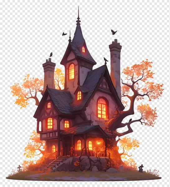 Tags: Halloween house autumn trees creepy aesthetic digital art enchanted home fairy tale house fall season fantasy house free download glowing windows gothic home haunted mansion mysterious building night scene orange glow spooky house spooky season transparent PNG whimsical illustration witch house