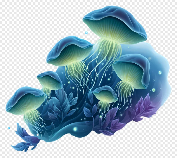 Dive into a magical world with this stunning free PNG of enchanting bioluminescent mushrooms. Featuring a vibrant cluster of blue and teal fungi with glowing green undersides and delicate, jellyfish-like tendrils, set against a dark background with ethereal glowing particles and mystical plant life. Perfect for fantasy-themed designs, game assets, digital art, scrapbooking, or adding a touch of wonder to any creative project. This high-quality, transparent PNG is ready for instant download to bring your imaginative visions to life. Get your free glowing mushroom illustration today!