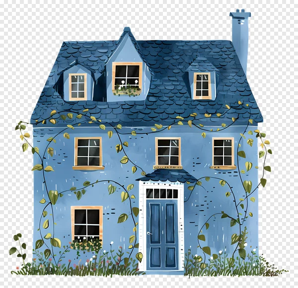 Step into a fairy tale with this enchanting free PNG image of a whimsical blue house. This charming illustration features a cozy cottage with a distinctive blue shingled roof, light blue walls adorned with climbing green vines and vibrant yellow-green leaves, and a lovely garden base filled with small flowers. The house boasts numerous windows with warm beige frames and a welcoming dark blue front door. Perfect for adding a touch of magic to your design projects, scrapbooking, digital art, presentations, or crafting. Download this high-quality, transparent background PNG instantly and bring a storybook aesthetic to your creative work. Ideal for web design, greeting cards, educational materials, and more!