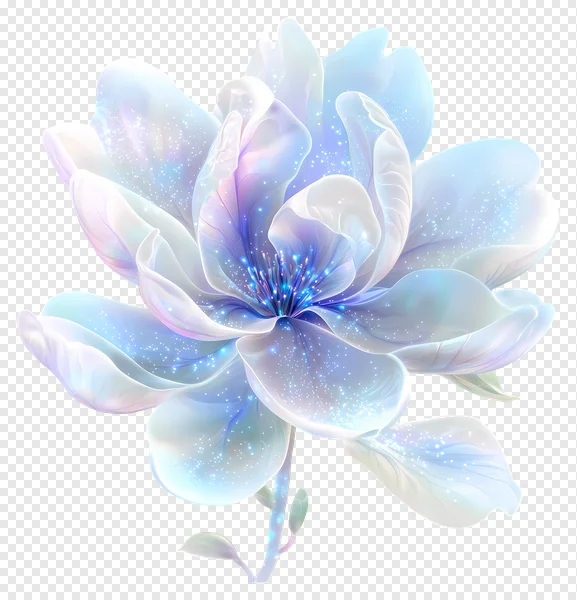 Download this stunning ethereal glowing fantasy flower PNG for free! Featuring translucent petals in delicate shades of shimmering blue, white, and lavender, adorned with sparkling light effects and a mystical glowing center. This high-quality, magical bloom is perfect for adding a touch of enchantment to your graphic design projects, digital art, wedding invitations, greeting cards, or any creative endeavor. With its transparent background, integration into any design is seamless. Get your free mystical floral clip art now and let your designs sparkle!