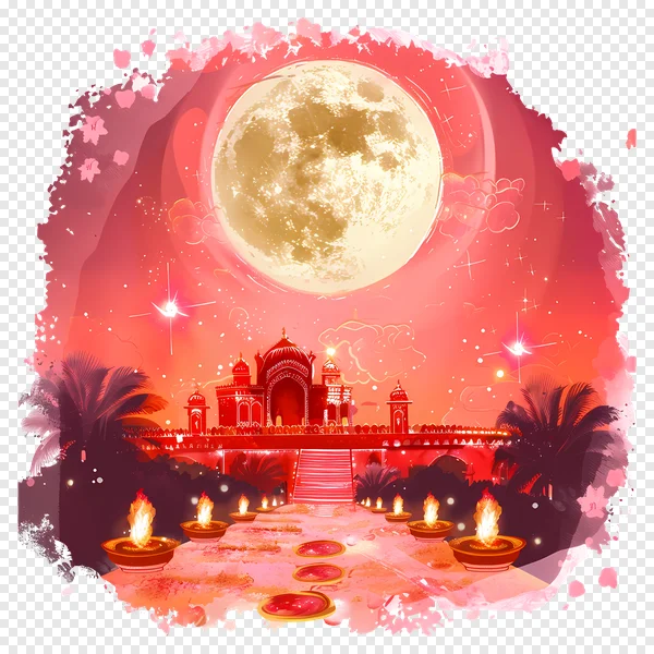 Tags: Celebration Cultural Diwali Diya Festival Free PNG Full Moon Hindu India Indian Temple Night Sky Oil Lamp Palace Palm Trees Pink Aesthetic Red Architecture Spiritual Stars Traditional Vibrant