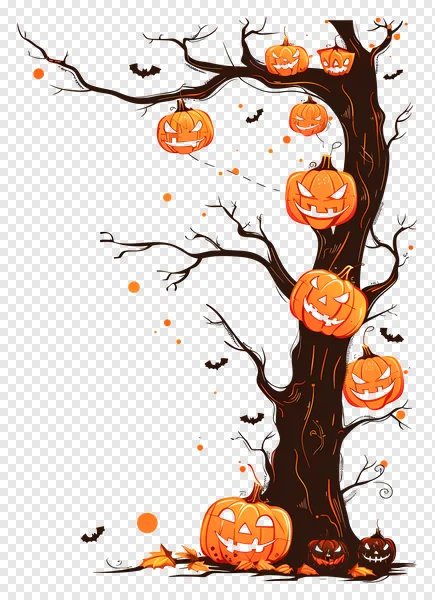 Unleash the spirit of Halloween with this captivating free PNG image! Featuring a gnarled, spooky tree adorned with multiple glowing Jack-o'-lanterns, mysterious bats flying around, and scattered luminous orange orbs, this illustration perfectly captures the eerie yet fun vibe of the season. The vibrant orange pumpkins, with their mischievous and scary carved faces, stand out against the deep black background, making it an ideal choice for spooky invitations, festive social media posts, website banners, or unique craft projects. Download this high-quality Halloween tree and pumpkin PNG today to add a touch of magic and fright to your designs. Perfect for creators looking for captivating holiday visuals!