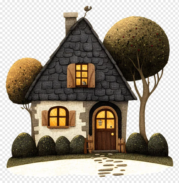 Discover this enchanting, hand-drawn whimsical cottage PNG, perfect for adding a touch of magic to your projects! Featuring a cozy stone house with a dark shingle roof, warm glowing windows, and an inviting arched wooden door. Two textured golden trees, one bearing red berries, frame this charming scene, complete with lush shrubs and a stone path. Ideal for storybook designs, game assets, greeting cards, or digital art. Download this transparent background, high-quality illustration for free and bring its cozy, nighttime glow to life in your creative work today!