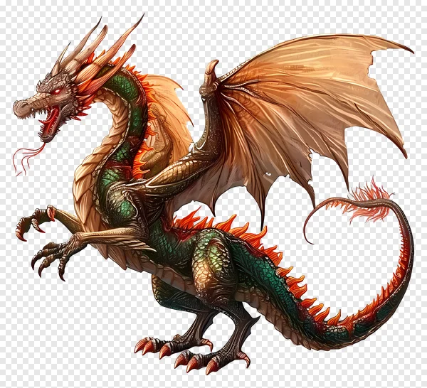 Unleash the power of fantasy with this stunning free PNG download of a majestic dragon! This vibrant mythical beast boasts intricate green and gold scales, broad golden wings, and a striking fiery red crest running along its back and tail. Its glowing red eyes, menacing fangs, and ready stance give it an epic, dynamic presence. Perfect for game development, graphic design projects, fantasy art, digital storytelling, or adding a powerful element to your creative works. Download this high-quality, transparent background dragon image now and bring your imagination to life!