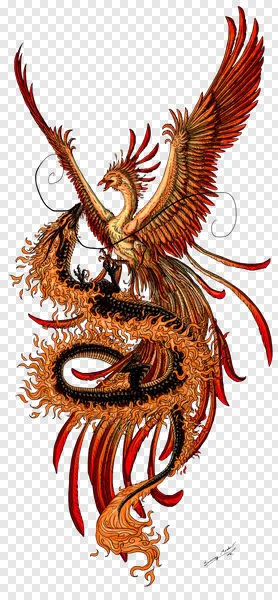 Tags: ancient mythology combat illustration digital art dragon epic clash fantasy art fiery fire bird flames free download legendary creatures mythical battle orange phoenix powerful red serpent tattoo design transparent PNG wings