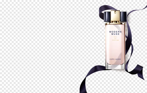Download a stunning, high-quality PNG of the iconic Estée Lauder Modern Muse Eau de Parfum bottle, elegantly wrapped with a sophisticated dark blue ribbon. This transparent background image features the luxury fragrance bottle with its signature gold and dark caps and a subtle pink liquid, perfect for seamless integration into any design project. Ideal for beauty bloggers, marketing campaigns, cosmetic advertisements, or graphic designers seeking premium, isolated product photography. Elevate your visual content with this exquisite and free-to-download perfume bottle image.