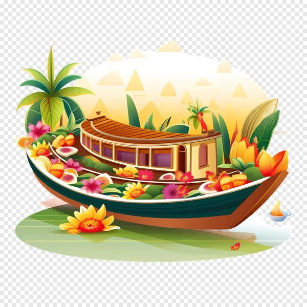 Immerse yourself in a vibrant tropical paradise with this stunning free PNG illustration. Featuring a beautifully decorated traditional boat, overflowing with lush exotic flowers like lotus and hibiscus, and a bounty of tropical fruits such as passion fruit. Majestic palm trees and distant stylized mountains complete this serene waterscape, all rendered in a captivating flat design style. Perfect for travel blogs, vacation promotions, cultural events, summer designs, or any project needing a touch of exotic charm. Download this high-quality vector-style image today and add a splash of color to your creative endeavors!