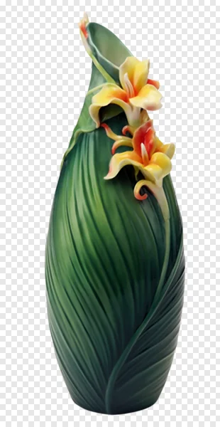 Discover this breathtaking free PNG of an exquisite ceramic vase, expertly designed to mimic a vibrant green tropical leaf with intricate vein details. Adorning its side are beautifully sculpted yellow and orange Canna Lily flowers, bringing an artistic touch of nature indoors. This unique piece combines the elegance of pottery with the freshness of botanical design, creating a stunning visual element. Perfect for adding sophistication to your graphic design projects, presentations, digital scrapbooking, or creating stunning decor mockups. Its transparent background ensures seamless integration into any creative work. Download this unique floral art piece today and elevate your designs!