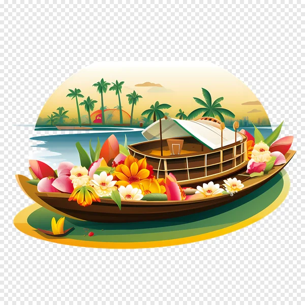 Download this stunning, free PNG image of a vibrant tropical boat, richly decorated with an array of colorful flowers. Set against a backdrop of tranquil blue waters, swaying palm trees, and a warm golden sunset, this illustration evokes a serene paradise. Perfect for travel blogs, vacation brochures, event invitations, website banners, social media posts, or any project needing an exotic, peaceful, or celebratory touch. The traditional houseboat design suggests a journey through scenic backwaters, adorned with beautiful blossoms like lotus and tropical flora. Get your transparent PNG download today for high-quality graphic design! Ideal for themes like summer, holiday, nature, culture, and relaxation.