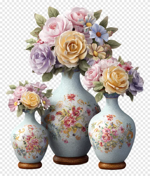 Download this stunning, high-quality PNG image featuring an exquisite arrangement of colorful flowers in three beautifully ornate ceramic vases. This free graphic showcases vibrant pink, sunny yellow, and delicate purple roses, along with various accent blooms and lush green leaves, all set against a clean transparent background. Perfect for adding a touch of vintage elegance, classical charm, or botanical beauty to your digital projects, scrapbooking, invitations, greeting cards, website designs, or home decor concepts. Enhance your creative work with this detailed, free-to-download floral vase PNG asset today!