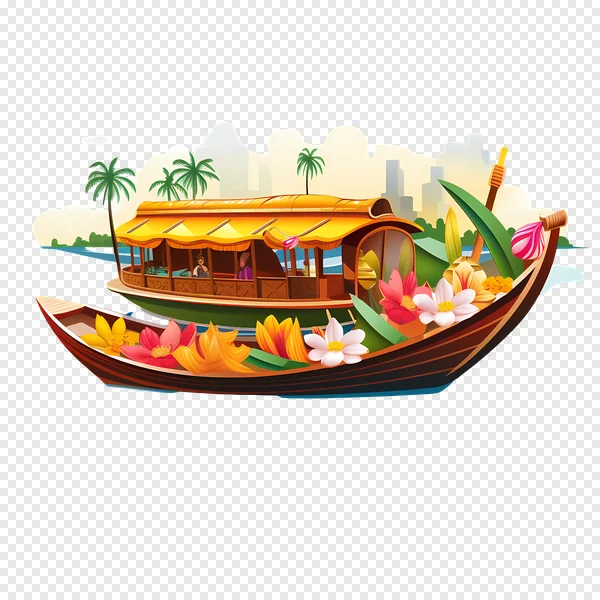 Immerse your design projects in the tranquil beauty of South India with this stunning free PNG download. Featuring a traditional Kerala houseboat (Kettuvallam) adorned with vibrant tropical flowers like lotuses and lilies, set against a serene backdrop of backwaters, swaying palm trees, and a distant modern cityscape. This high-quality, transparent background illustration is perfect for travel blogs, presentations, cultural event promotions, website banners, or any creative endeavor needing an exotic and picturesque touch. Download this beautiful, culturally rich graphic today and bring a piece of Kerala's charm to your work!