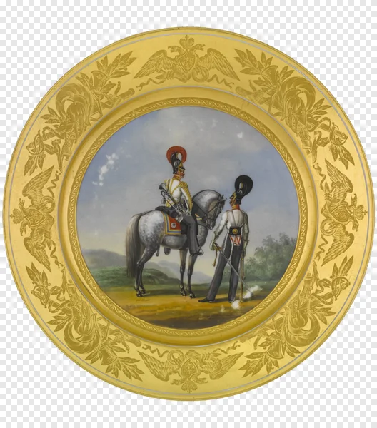Capture the grandeur of a bygone era with this free, high-quality PNG image depicting two Russian Imperial Hussar soldiers. One soldier, trumpet in hand, proudly sits atop a majestic grey horse, while his comrade stands attentively by, holding a sabre. This stunning vintage miniature painting is framed by an opulent gold decorative plate, richly embellished with the iconic double-headed eagle, intricate laurel wreaths, and military regalia, hinting at 19th-century elegance. Ideal for history enthusiasts, graphic designers, or anyone seeking unique artwork, this transparent background PNG is perfect for historical projects, digital scrapbooking, presentations, or adding a touch of classic sophistication to any creative endeavor. Download now and bring imperial history to life!