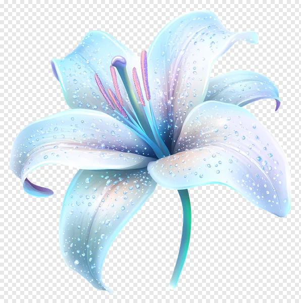 Discover the ethereal beauty of this exquisite white lily PNG, adorned with sparkling water droplets. Its soft blue and subtle purple hues, combined with a perfectly transparent background, make it an ideal asset for any creative project. Whether you're designing stunning wedding invitations, enhancing web graphics, creating digital art, or simply adding a touch of natural elegance to your presentations, this high-quality flower image is perfect. Download this gorgeous, dew-kissed lily for free and bring a fresh, vibrant aesthetic to your designs today! Perfect for personal and commercial use.