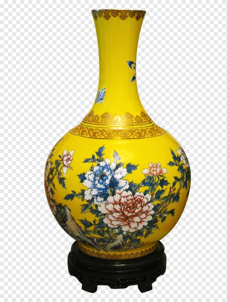 Discover our magnificent free PNG download of a traditional Chinese porcelain vase. This vibrant yellow vase features exquisite hand-painted peony flowers in shades of blue, pink, and white, alongside delicate blue butterflies and intricate gold ornate patterns. Sitting on a detailed dark wooden stand, this oriental art piece adds elegance and a touch of antique beauty to any project. Ideal for graphic design, digital art, educational materials, virtual home decor, or website backgrounds. Get this high-quality cutout with a transparent background instantly for your creative needs and enhance your visuals!