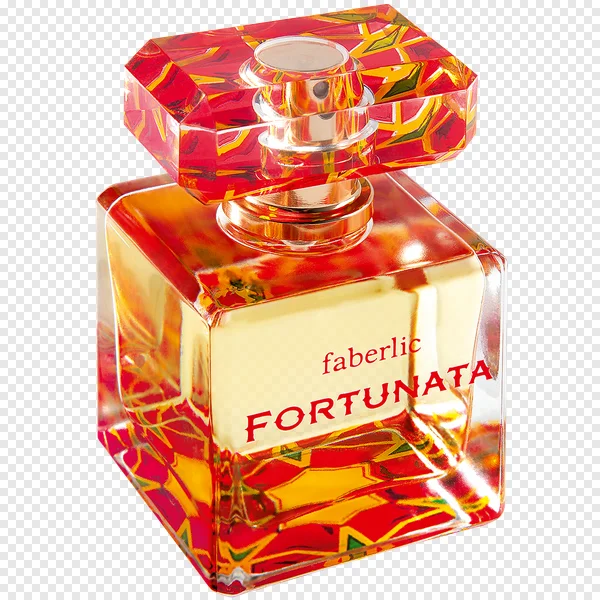 Download this stunning, high-quality Faberlic Fortunata perfume bottle PNG image for free. Featuring a luxurious square glass bottle with a vibrant golden liquid and a unique, eye-catching faceted cap adorned with a geometric red, yellow, and green pattern, this fragrance image exudes elegance and sophistication. The clear 'Faberlic Fortunata' branding in red stands out perfectly. Ideal for beauty product showcases, marketing campaigns, graphic design projects, or adding a touch of luxury to your website and social media. Get this premium transparent background PNG for your creative needs today!