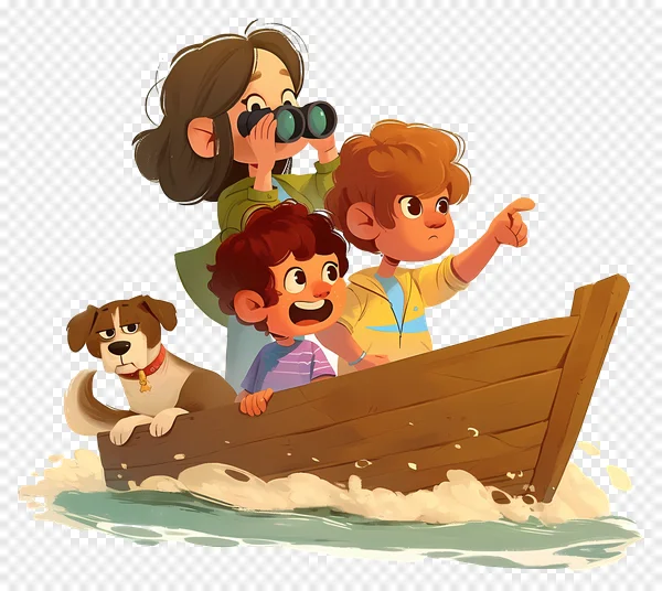 Set sail on a vibrant visual journey with this free, high-quality cartoon PNG illustration! Featuring a mother scanning the horizon with binoculars, two enthusiastic children pointing the way, and their loyal dog on a sturdy wooden boat, this image perfectly captures the spirit of family adventure and discovery. The boat is depicted splashing through gentle waves, ideal for conveying excitement and exploration. Download this delightful, transparent-background image for educational content, children's books, website designs, presentations, or any creative project needing cheerful family fun on the water.