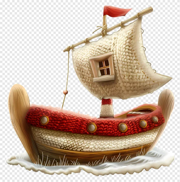 Download this charming fantasy boat PNG image for free! Featuring a unique shell-covered ship with a cozy cabin and vibrant red accents, this illustration is perfect for children's projects, storybook designs, game development, or adding a touch of magic to your creative work. High-resolution and transparent background for easy integration. Get your free download now and set sail on a creative adventure!