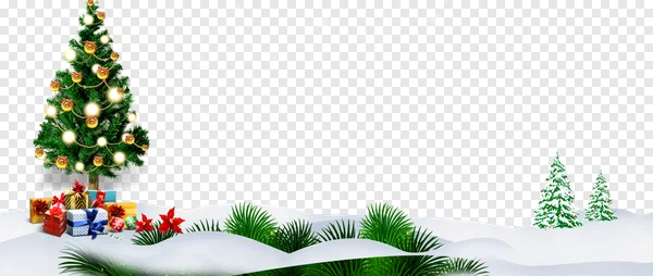 Download this enchanting free PNG image featuring a festive Christmas border. On the left, a beautifully decorated Christmas tree sparkles with golden lights, bells, and ornaments, surrounded by colorful wrapped gifts and a vibrant red poinsettia atop glistening snow. The right side showcases charming snow-covered evergreen trees. The transparent center is perfect for adding your personalized text or elements. Ideal for holiday greetings, party invitations, social media banners, website headers, or any festive design project. Get into the spirit of the season with this high-quality, free Christmas graphic!