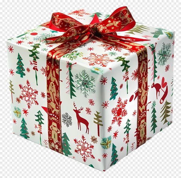 Download our high-quality, free PNG image of a beautiful Christmas gift box, perfect for adding a festive touch to your holiday projects! This eye-catching present features crisp white wrapping paper adorned with vibrant red snowflakes, playful reindeer, and classic green Christmas trees. It's elegantly tied with a shimmering red ribbon, intricately patterned with gold accents, creating a luxurious and joyful look. Ideal for greeting cards, digital marketing, website banners, social media posts, or any design celebrating the holiday season. Get this transparent background PNG today and bring the spirit of giving to life!