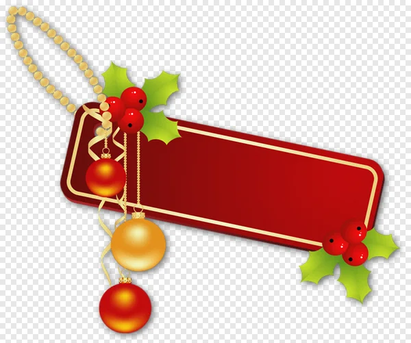 Download this beautiful free PNG of a festive Christmas tag or holiday banner, perfect for adding a touch of cheer to your projects! This elegant design features a rich red rectangular tag with a golden border, adorned with classic green holly leaves, vibrant red berries, and shimmering gold and red Christmas baubles, alongside a decorative gold beaded chain and ribbon. Ideal for greeting cards, invitations, digital scrapbooking, web design, or holiday sales promotions. Get your transparent background Christmas tag download today and make your designs shine!