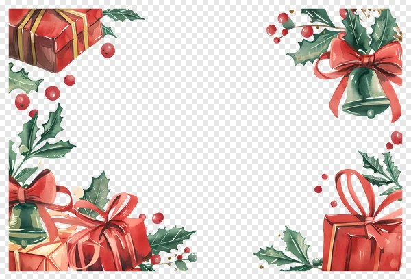 Elevate your holiday designs with this beautiful free Christmas watercolor frame PNG! Featuring vibrant red gift boxes, classic green holly leaves with berries, and charming bells adorned with red bows, all rendered in a soft watercolor style against a transparent background. Perfect for creating festive invitations, greeting cards, social media posts, digital scrapbooks, or adding a joyful touch to any project. Download this high-quality, transparent PNG to instantly frame your content with holiday cheer. Get yours now and spread the festive spirit!