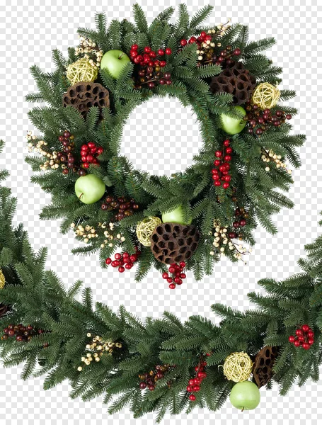Download this stunning free PNG of a vibrant Christmas wreath and matching garland, perfect for your holiday projects. Featuring lush evergreen branches adorned with bright red berries, creamy white berries, realistic green apples, unique dried lotus pods, and elegant woven spheres, this transparent image is ideal for festive designs, digital cards, website banners, or social media posts. Instantly elevate your winter and holiday themes with this beautiful, natural decoration for free!