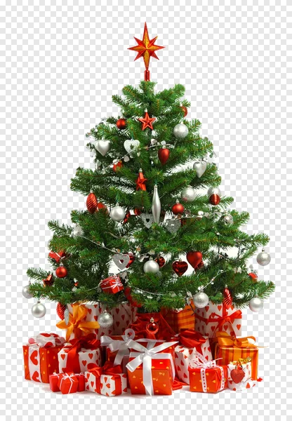 Download this vibrant, free PNG of a beautifully decorated Christmas tree, adorned with shimmering red and silver ornaments, including festive hearts and stars, topped with a glittering red star. A generous pile of brightly wrapped gifts in red, white, and orange, many with heart patterns, surrounds the base. Perfect for adding instant holiday spirit to your website, greeting cards, marketing campaigns, or personal projects. This high-quality image with a transparent background is ideal for Christmas, holiday season, and winter celebration themes. Get your free download now!