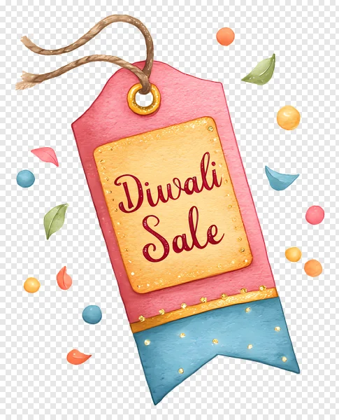 Download this beautiful, vibrant watercolor Diwali Sale tag PNG for free! Perfect for announcing special discounts and promotions during the festive season. This hand-drawn illustration features a charming pink tag with a golden 'Diwali Sale' banner, accented by a blue bottom and playful festive elements like leaves and colorful beads. Ideal for e-commerce, social media posts, advertising, banners, or any digital marketing material to celebrate the Festival of Lights. Get your transparent PNG now and make your Diwali promotions shine!