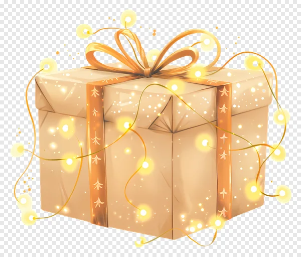 Download this enchanting free PNG of a festive gift box wrapped in warm golden fairy lights, complete with a beautiful ribbon featuring delicate tree patterns. Perfect for adding a magical touch to your Christmas cards, holiday greetings, birthday invitations, digital scrapbooking, website banners, or social media posts. The transparent background makes it easy to integrate into any design. Get this sparkling present with a cozy, illuminated glow for your celebratory projects today – absolutely free!