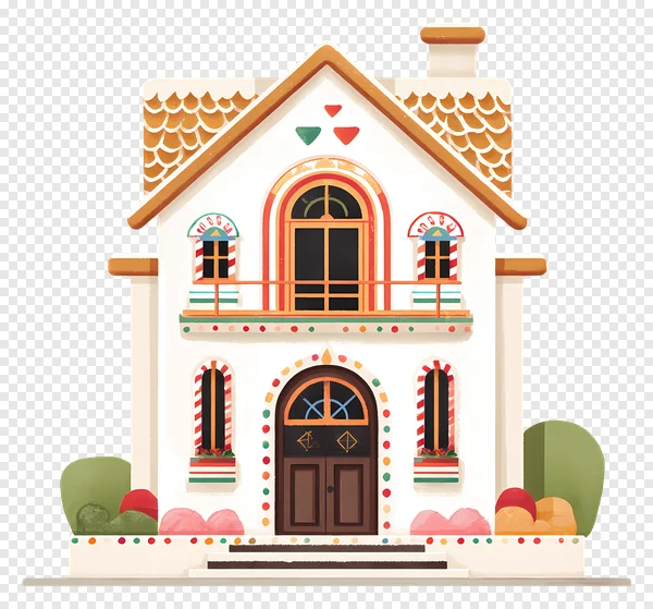 Immerse yourself in the holiday spirit with this delightful, free PNG image of a festive gingerbread house. This charming illustration features a cozy white house adorned with classic gingerbread-style orange roof tiles, delicate white frosting details, and colorful candy decorations. Notice the candy cane striped windows, a welcoming front door, a whimsical balcony, and a snowy chimney, all set against a transparent background. Perfect for enhancing your Christmas cards, digital scrapbooking, winter-themed designs, website banners, or any creative holiday project. Download this high-quality, cute cartoon holiday home PNG instantly and add a touch of sweet cheer to your creations!