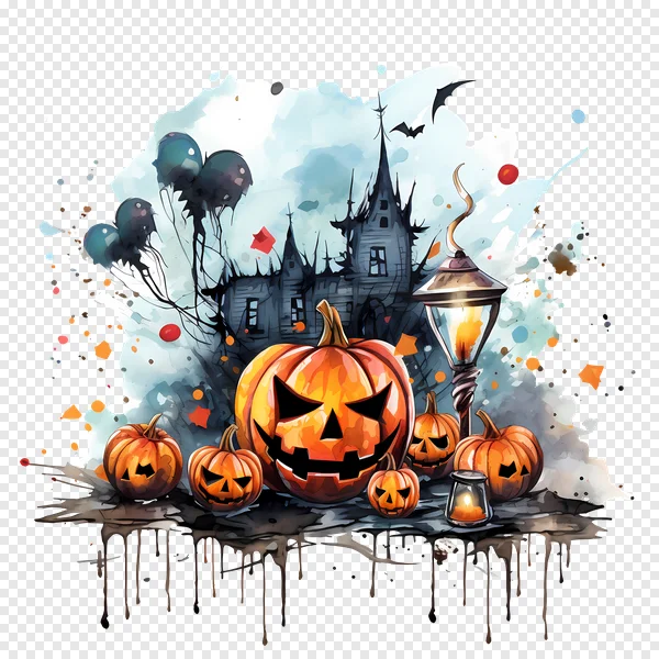 Unleash your creativity this Halloween with our captivating, free watercolor PNG image! Featuring grinning jack-o'-lanterns, a mysterious haunted house with pointed spires, a flickering street lamp, and shadowy bats against a dreamy, cloudy backdrop. This high-quality, transparent Halloween illustration is perfect for digital designs, party invitations, social media posts, crafts, or spooky decorations. The unique hand-painted style with vibrant oranges, eerie blues, and a textured, dripping base creates a truly atmospheric scene. Download this versatile Halloween graphic instantly and add a touch of festive fright to all your projects – absolutely free!