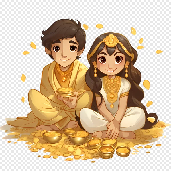 Download this enchanting free PNG of two adorable Indian children, a boy and a girl, surrounded by a glittering pile of gold coins and bowls. This charming illustration, perfect for Diwali, Lakshmi Puja, prosperity themes, or cultural celebrations, features the kids in traditional attire, smiling joyfully. Ideal for greeting cards, invitations, educational material, or digital art projects. Get your high-quality, transparent background image now to add a touch of wealth and happiness to your designs! Enhance your creative projects with this vibrant, heartwarming depiction of abundance and cultural festivity.