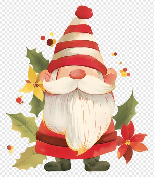 Tags: Christmas clipart Christmas elf Christmas gnome Santa gnome Santa hat digital art festive decoration festive gnome free download garden gnome holiday gnome holly leaves long beard poinsettia flowers red and white red berries red nose striped hat transparent PNG watercolor gnome winter illustration