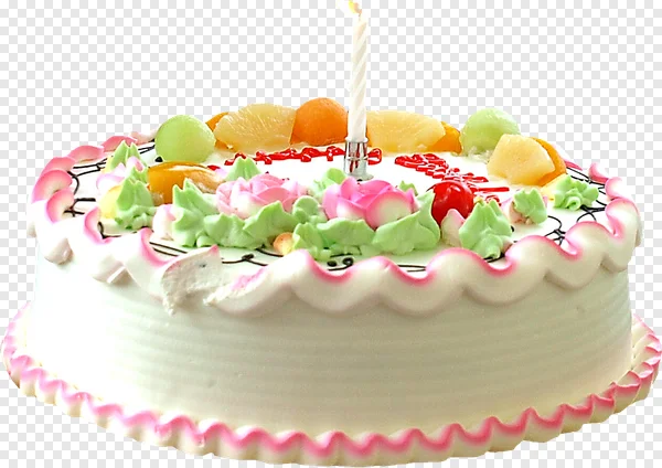 Download this exquisite Birthday Cake PNG image for free, featuring a beautifully decorated white cake with a lit candle, vibrant fruit toppings, and delicate pink and green frosting designs. The cake is adorned with elegant pink scalloped borders, inviting everyone to celebrate. Perfect for adding a festive touch to your digital projects, invitations, social media posts, greeting cards, or party announcements. The transparent background makes it effortlessly easy to integrate this high-quality celebration cake image into any design. Get this delicious-looking dessert graphic today and make your creations truly pop!
