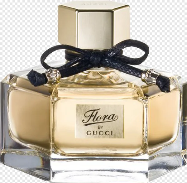 Download this exquisite Flora by Gucci perfume bottle PNG image for free! Featuring the elegant hexagonal glass bottle with its luminous golden liquid, a chic black braided bow, and the iconic 'Flora by Gucci' label, this high-quality transparent background image is perfect for designers, beauty bloggers, e-commerce stores, or anyone creating captivating visual content. Enhance your projects with this touch of luxury and effortless elegance. Get your transparent fragrance bottle now!