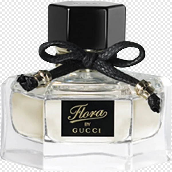 Download a high-quality, free PNG of the iconic Flora by Gucci perfume bottle, perfect for your design projects. This elegant image features the clear glass bottle, a sophisticated black hexagonal cap, and the signature black leather-like bow with delicate gold accents. With its transparent background, this luxury women's fragrance image is ready for immediate use in marketing materials, blogs, or personal creations. Get this classic and beautiful product shot for your visual content today!