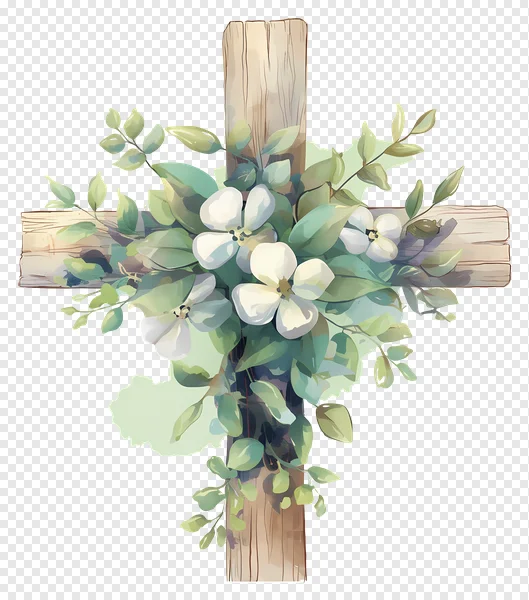 Download this beautiful floral cross PNG image for free! Featuring a rustic wooden cross adorned with delicate white flowers and lush green foliage, this watercolor-style graphic is perfect for Easter, religious projects, faith-based designs, or adding a touch of serenity to your artwork. High-resolution and transparent background for easy integration into your projects. Enhance your designs with this stunning symbol of faith today!