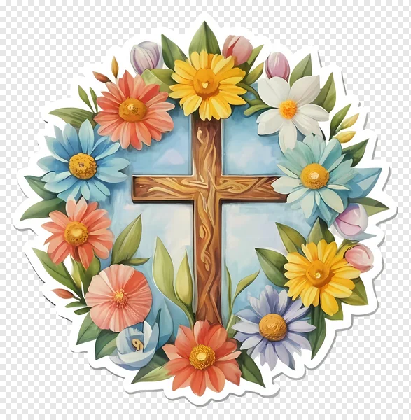 Download this beautiful floral cross PNG image for free! Featuring a rustic wooden cross surrounded by vibrant watercolor flowers – daisies, tulips, and more – against a soft blue sky background. Perfect for religious projects, Easter designs, faith-based graphics, or adding a touch of serenity to your artwork. High-resolution and transparent background for easy integration into your designs. Get your free download now!