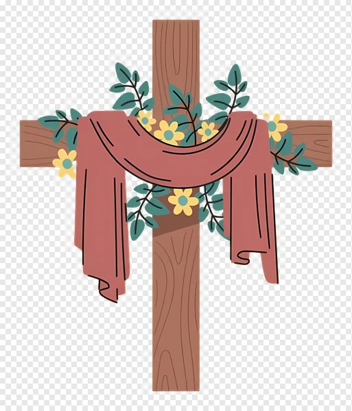 Download this beautiful Floral Draped Wooden Cross PNG for free, featuring a rustic wooden cross adorned with vibrant yellow flowers, lush green leaves, and a gracefully draped reddish-pink fabric. Perfect for celebrating Easter, Lent, or any Christian occasion. This high-quality illustration with a transparent background is ideal for church bulletins, worship slides, religious crafts, scrapbooking, digital art projects, and personal spiritual designs. Enhance your content with this meaningful symbol of faith, resurrection, and hope. Get your free transparent PNG clipart today!