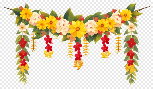 Download this beautiful floral garland PNG for free! Featuring a vibrant arrangement of yellow, red, and white flowers with delicate leaves and a charming butterfly, this image is perfect for adding a touch of nature to your designs. Use it for wedding invitations, greeting cards, website backgrounds, scrapbooking, or any project needing a floral accent. High-resolution and transparent background for easy integration. Get your free download now!