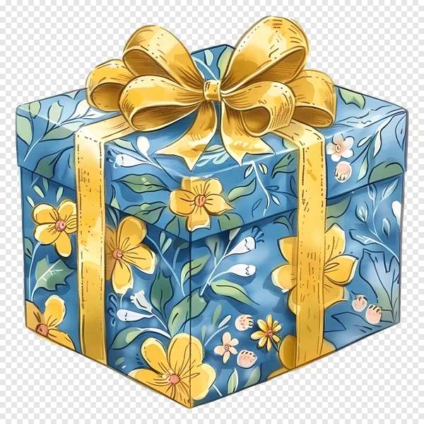 Download this beautiful floral gift box PNG image for free! Perfect for birthday cards, celebration graphics, gift wrapping designs, and more. This high-quality illustration features a vibrant blue box adorned with a golden yellow bow and delicate flower patterns. Use it to add a touch of elegance to your projects – no attribution required! Enhance your designs with this versatile and charming gift box graphic. Available in transparent PNG format for easy integration.