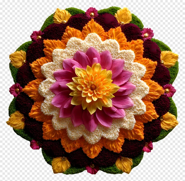Download this stunning floral mandala PNG image for free! Featuring a vibrant and intricate arrangement of dahlias, chrysanthemums, and other colorful flowers, this design is perfect for backgrounds, invitations, scrapbooking, or any project needing a touch of natural beauty. High-resolution and transparent background for easy integration. Enhance your creative projects with this beautiful flower pattern today!