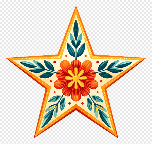 Download this beautiful floral star PNG for free! Featuring a vibrant orange starburst adorned with a detailed red flower and lush green leaves, this image is perfect for adding a touch of folk art, bohemian style, or festive flair to your projects. Use it for scrapbooking, graphic design, social media posts, or any creative endeavor. High-resolution and transparent background for easy integration. Get your free download now!
